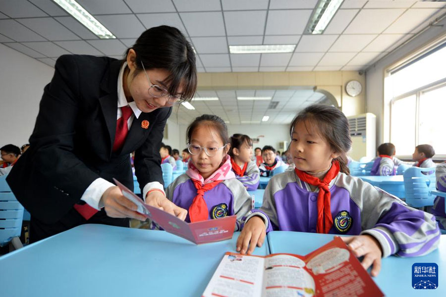 1/012月3日,在山東青島壽光路小學開展的憲法知識進校園活動上,法官在指導學生學習憲法知識。(新華社發(fā) 王海濱/攝)
