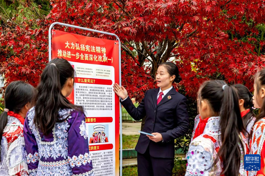 1/012月3日,貴州省黔西市人民檢察院的檢察干警在新仁苗族鄉(xiāng)化竹小學為學生普及憲法知識。(新華社發(fā) 范暉/攝)