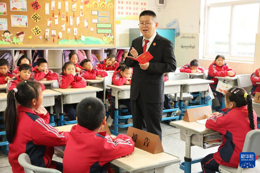 1/012月3日,在浙江省湖州市德清縣乾元鎮(zhèn)中心小學的模擬法庭上,法官為學生們講解憲法知識。(新華社發(fā) 倪立芳/攝)