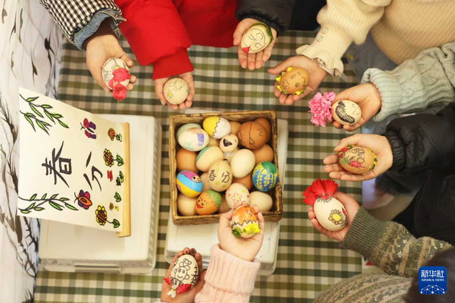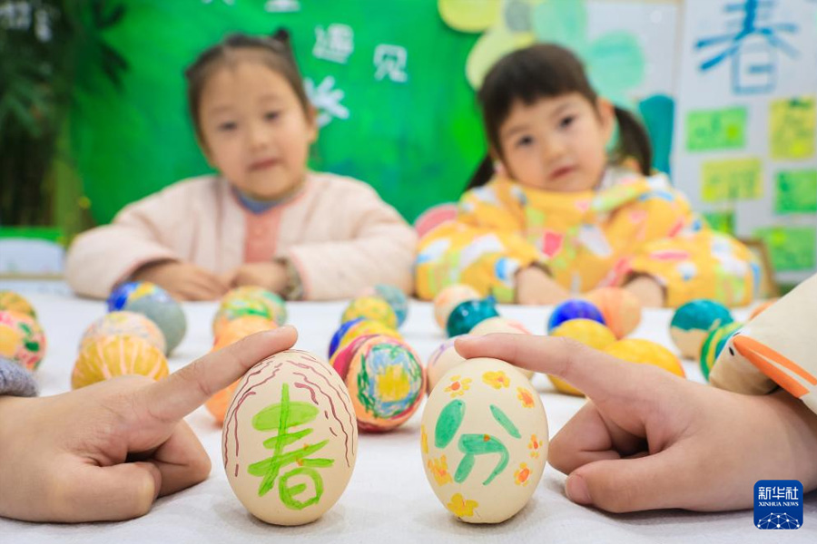 1/03月20日,在江蘇省揚(yáng)州市江都區(qū)育才幼兒園,小朋友們體驗(yàn)“立蛋”習(xí)俗。(新華社發(fā) 任飛/攝)