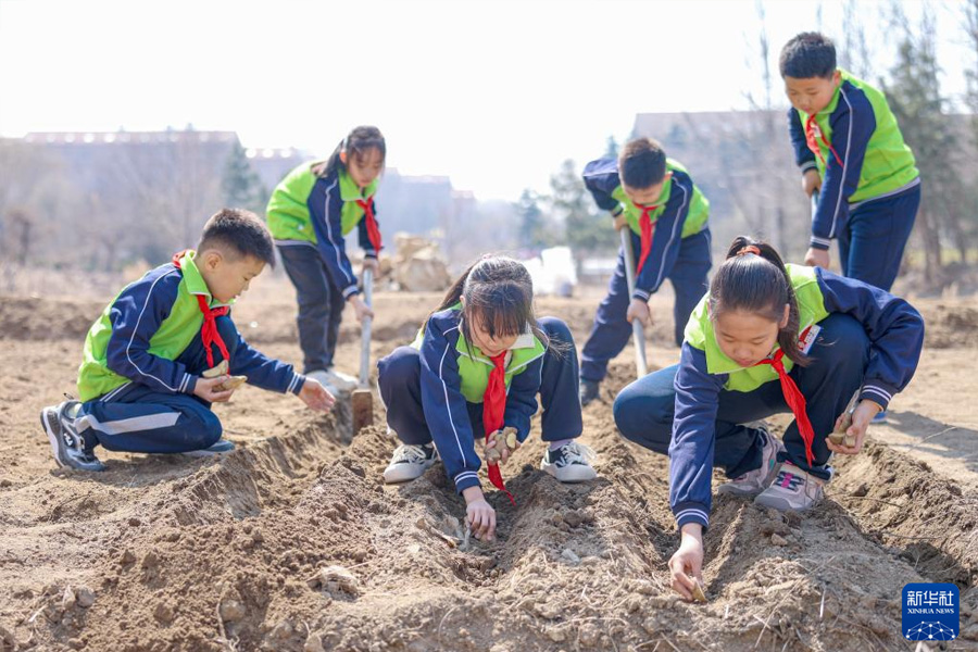 1/03月20日,在山東省榮成市府新小學(xué)勞動(dòng)實(shí)踐基地,學(xué)生們?cè)诓藞@里種土豆。(新華社發(fā) 李信君/攝)
