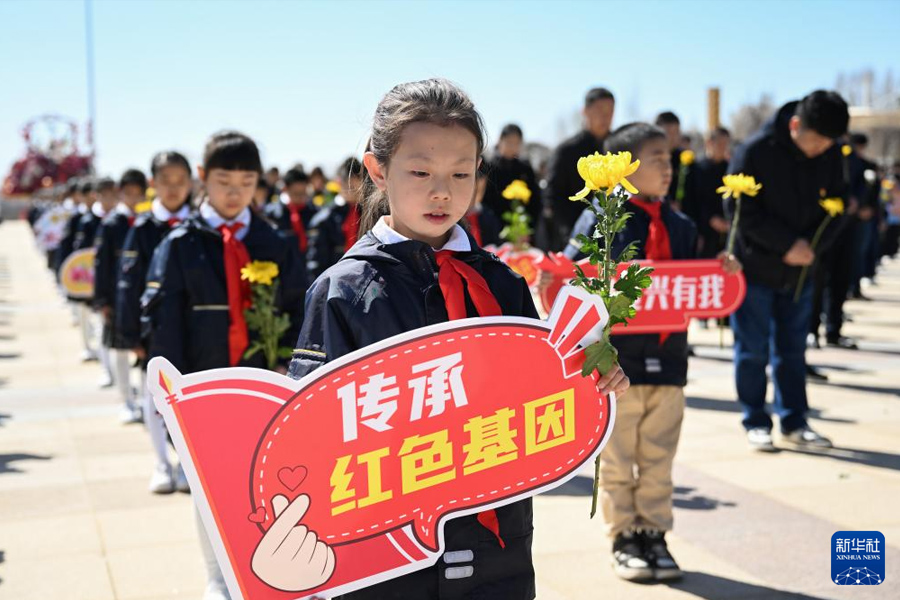 1/04月2日,少先隊員在內(nèi)蒙古呼和浩特市大青山紅色文化公園默哀。(新華社記者 貝赫/攝)
