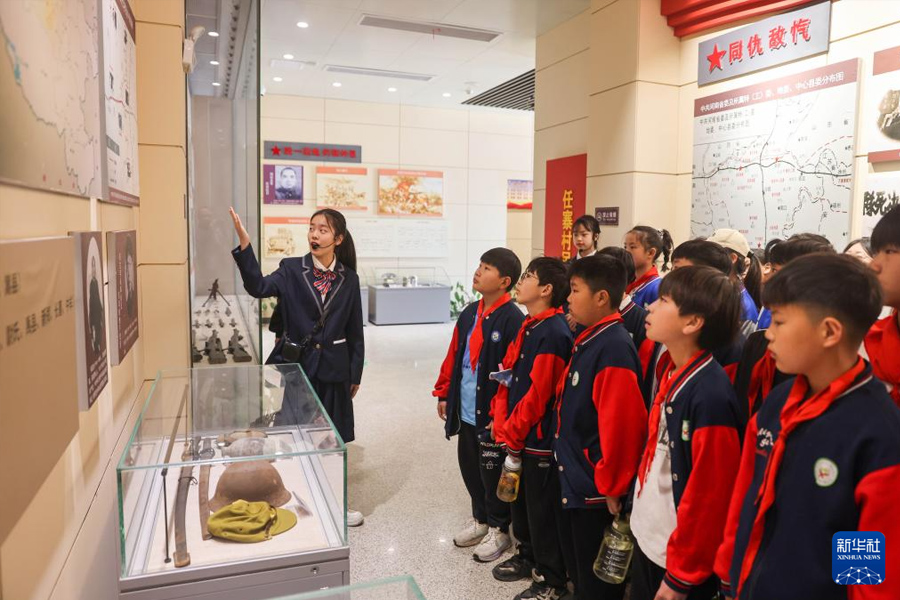 1/04月2日,講解員在河南省平頂山市寶豐革命紀念館為學(xué)生講述抗戰(zhàn)歷史。(新華社發(fā) 何五昌/攝)