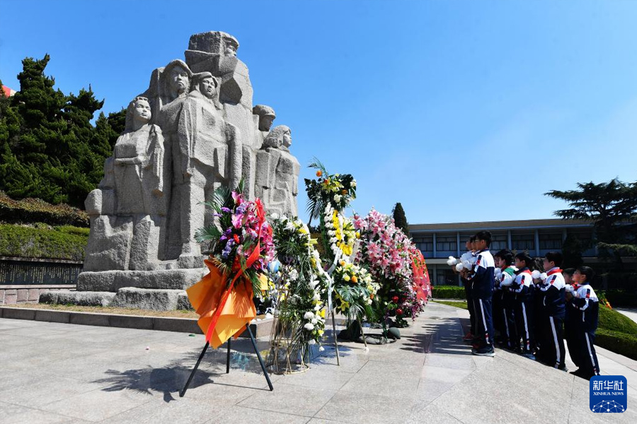 1/04月2日,山東省青島市市北區(qū)普新小學(xué)學(xué)生在革命烈士雕塑前獻花致敬。(新華社發(fā) 王海濱/攝)