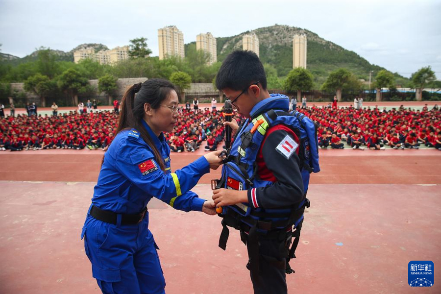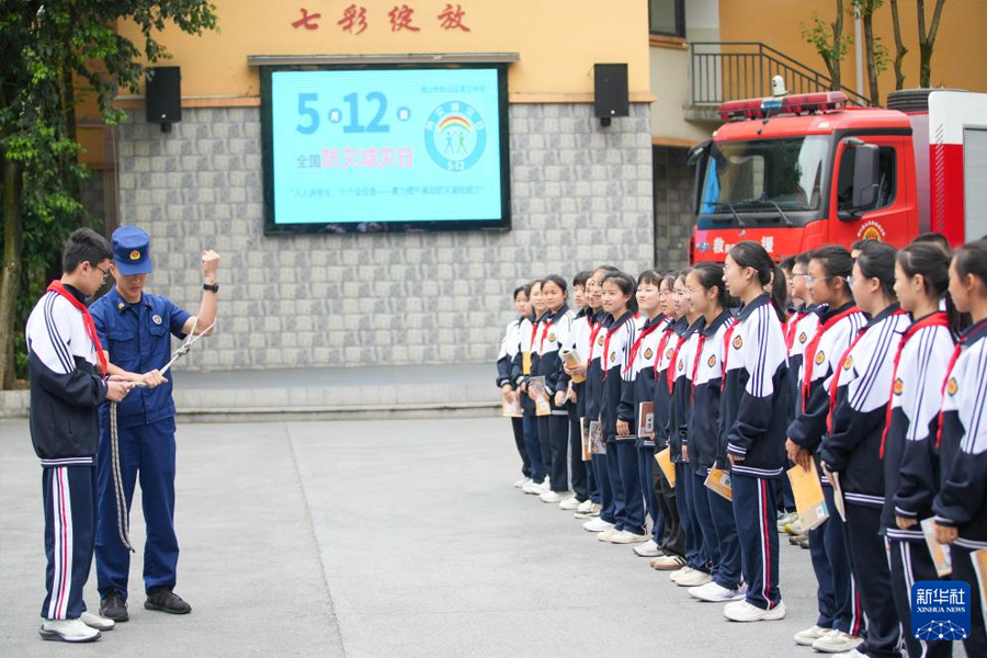 1/05月9日,消防救援人員給四川省眉山市彭山區(qū)第三中學(xué)的學(xué)生講解安全繩知識。(新華社發(fā) 翁光建/攝)