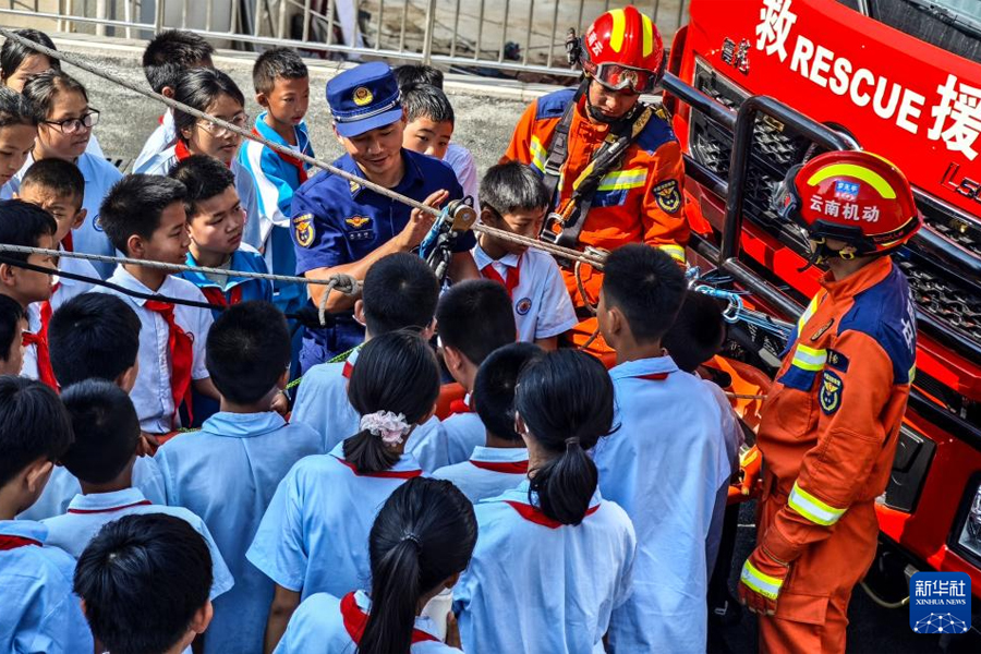 1/05月9日,在云南省普洱市景谷縣森林消防中隊,消防員向?qū)W生講解滑輪在救援中的運用。(新華社發(fā) 郭元首/攝)