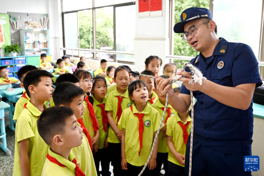 1/05月9日,浙江省武義縣消防大隊救援人員為武義縣實驗小學(xué)學(xué)生講解逃生繩的使用方法。(新華社發(fā) 張建成/攝)