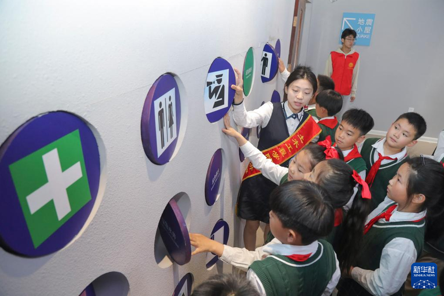 1/05月8日,江蘇省徐州市瀟湘路學(xué)校的學(xué)生在防震減災(zāi)教育科普基地學(xué)習(xí)避險標(biāo)志。(新華社發(fā) 白雪/攝)