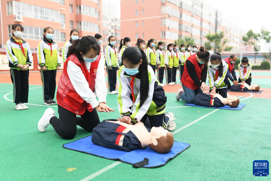 1/05月11日,在河北省石家莊新樂市民生街小學(xué),志愿者向?qū)W生講解心肺復(fù)蘇急救知識。(新華社發(fā) 賈敏杰/攝)