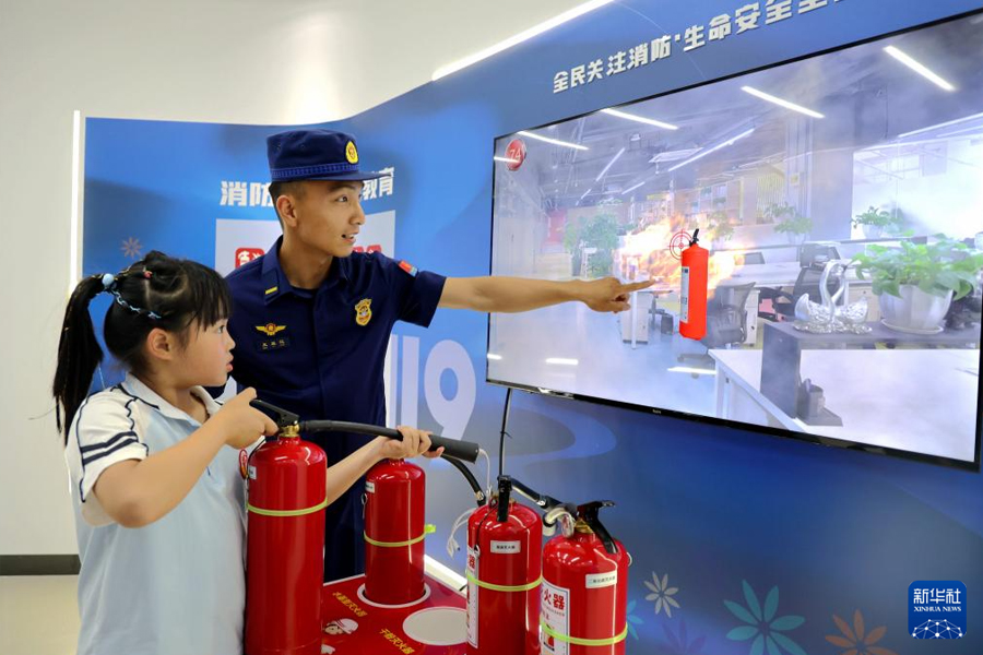1/05月11日,在山東省濱州市陽信縣勞店鎮(zhèn)科普教育大廳,小朋友在消防救援隊員的指導(dǎo)下進(jìn)行模擬滅火訓(xùn)練。(新華社發(fā) 初寶瑞/攝)