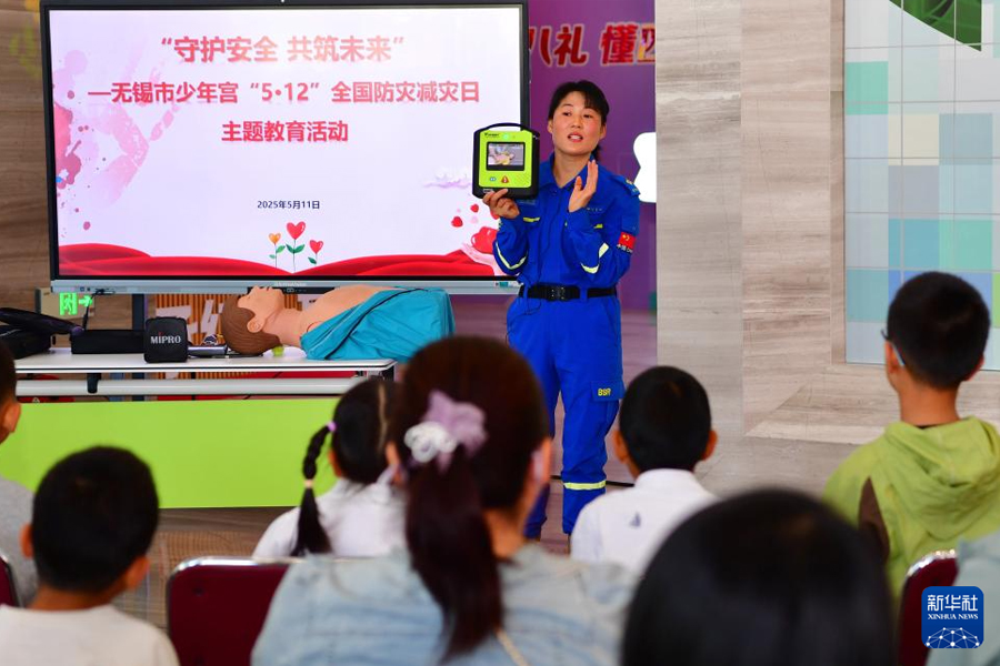 1/05月11日,在江蘇省無錫市少年宮,無錫藍(lán)天救援隊隊員為小朋友和家長講解AED急救設(shè)備使用方法。(新華社發(fā) 還月亮/攝)