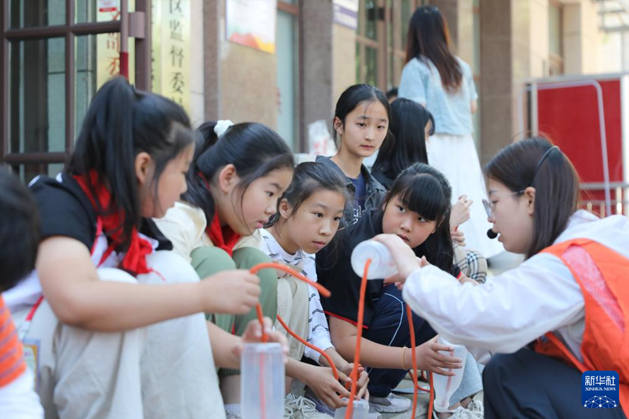 1/05月11日,學(xué)生在河南省焦作市溫縣岳村街道慈勝社區(qū)防災(zāi)減災(zāi)宣傳活動現(xiàn)場學(xué)習(xí)制作拋繩器。(新華社發(fā) 黃福興/攝)