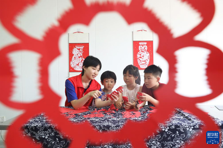 1/07月11日,在河北省唐山市豐潤(rùn)區(qū)燕山路街道欣園社區(qū)暑托班上,志愿者在指導(dǎo)孩子們學(xué)習(xí)剪紙。(新華社發(fā) 朱大勇/攝)