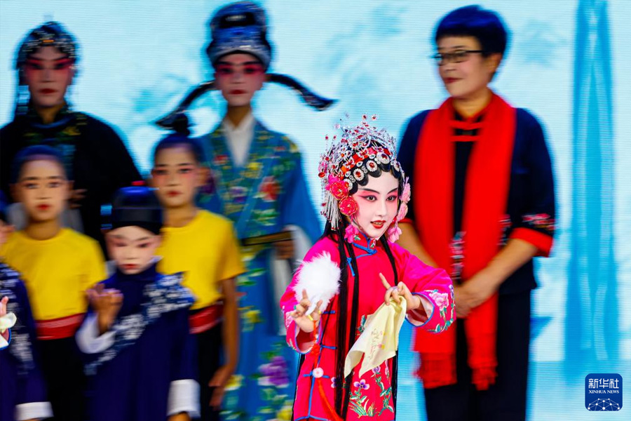 1/07月12日,在天津市濱海新區(qū)漢沽大劇院,孩子們?cè)诒硌輦鹘y(tǒng)戲曲。(新華社發(fā) 杜鵬輝/攝)