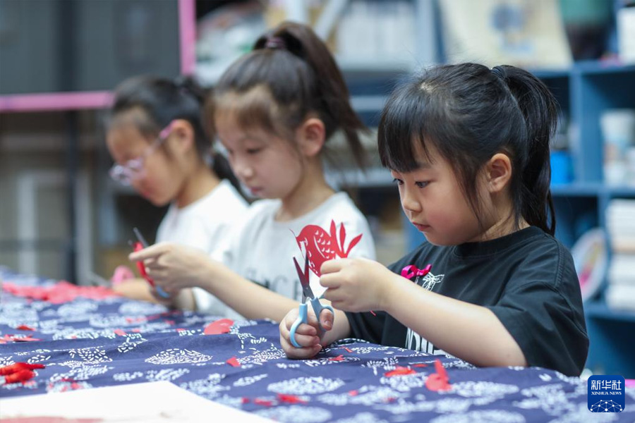 1/07月12日,在江蘇省興化市昭陽(yáng)街道垛上農(nóng)民畫非遺工坊,小朋友在老師的指導(dǎo)下練習(xí)剪紙。(新華社發(fā) 周社根/攝)