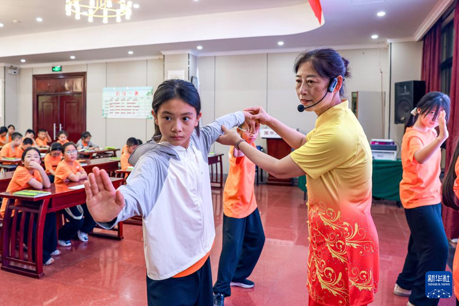 1/07月12日,在江蘇省揚(yáng)州市江都區(qū)婦聯(lián)舉辦的公益國(guó)學(xué)夏令營(yíng)活動(dòng)中,武術(shù)教練指導(dǎo)兒童練習(xí)五步拳。(新華社發(fā) 任飛/攝)