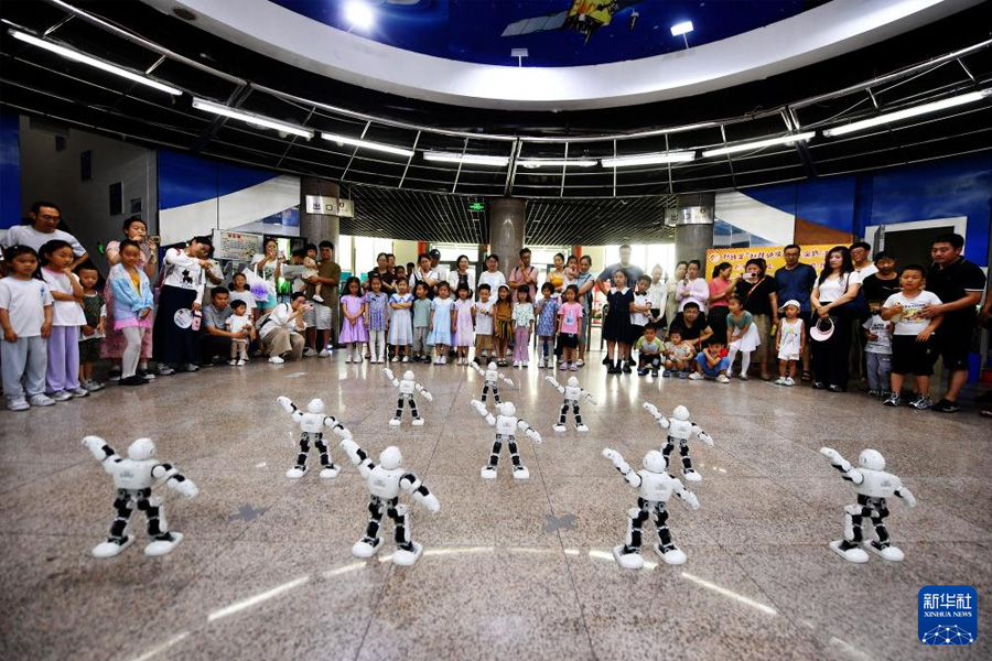 1/07月12日,山東省青島市市北區(qū)海安幼兒園的小朋友們?cè)谟^看舞蹈機(jī)器人表演。暑假期間,孩子們通過(guò)參加形式多樣的活動(dòng),豐富暑期生活,暢享快樂(lè)時(shí)光。(新華社發(fā) 王海濱/攝)