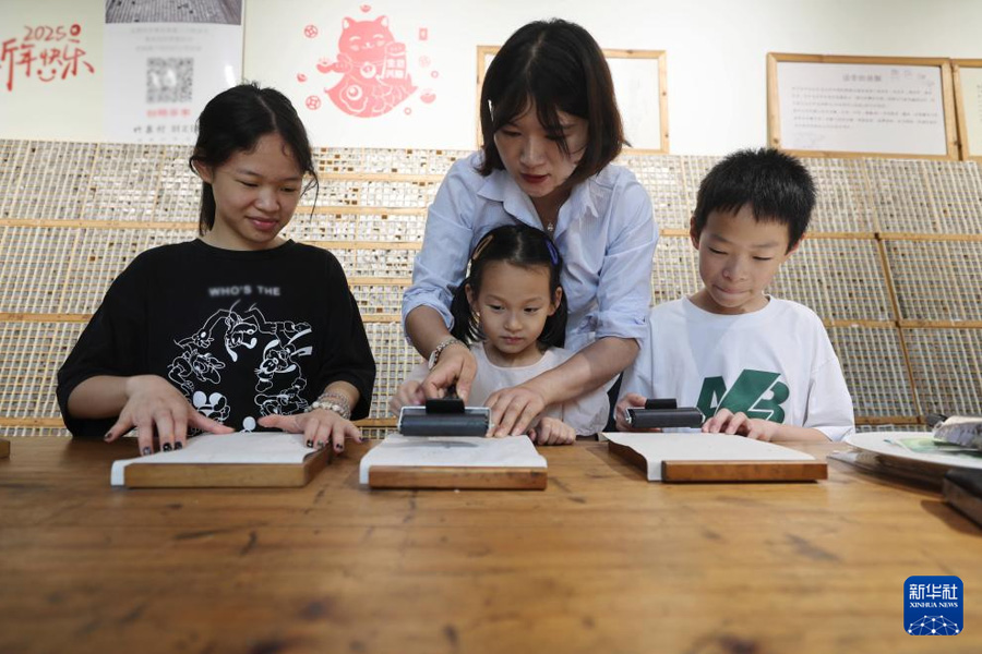 1/07月12日,在山東省臨沂市沂南縣銅井鎮(zhèn)竹泉村時(shí)光印記活字印刷體驗(yàn)館,參加研學(xué)游的孩子們?cè)隗w驗(yàn)活字印刷術(shù)。(新華社發(fā) 王彥冰/攝)