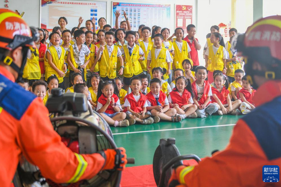 1/07月25日,在湖南省永州市道縣消防救援大隊,消防救援人員給孩子們普及消防器材使用知識。(新華社發(fā) 蔣克青/攝)