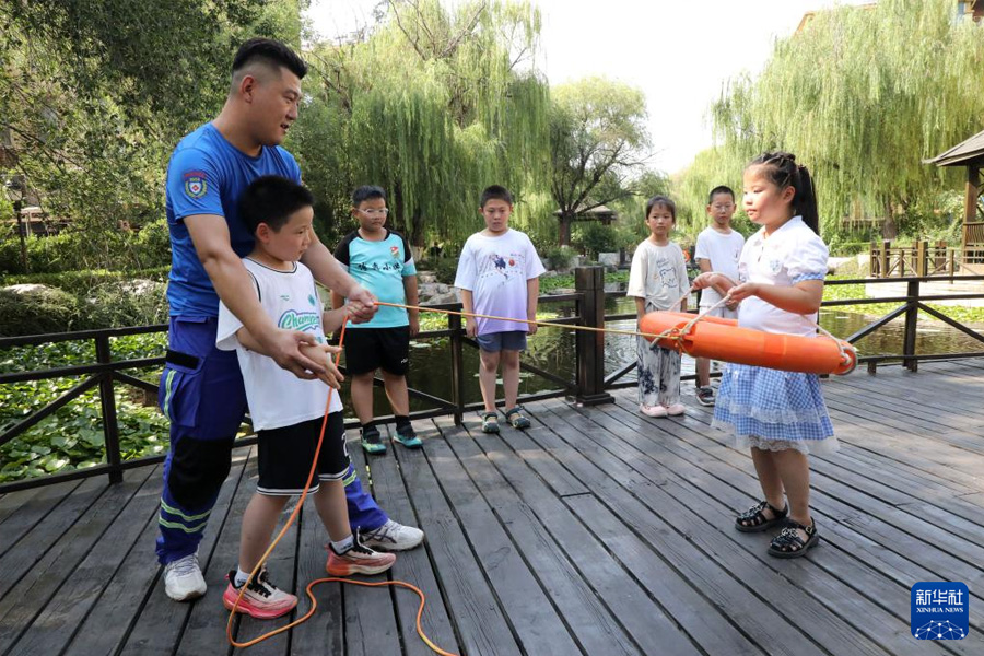 1/07月25日,在山東省濱州市博興縣城東街道東城社區(qū),博興縣“9958”應急救援隊志愿者指導小朋友使用救生圈演練溺水自救互救基本技能。(新華社發(fā) 陳彬/攝)
