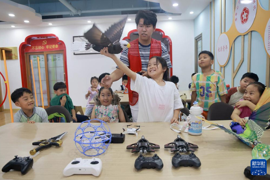 1/07月25日,在山東省臨沂市蘭山區(qū)銀雀山街道桃源社區(qū)暑假托管班上,蘭山區(qū)機器人協(xié)會的志愿者協(xié)助小朋友體驗鷹造型的無人機。(新華社發(fā) 許傳寶/攝)