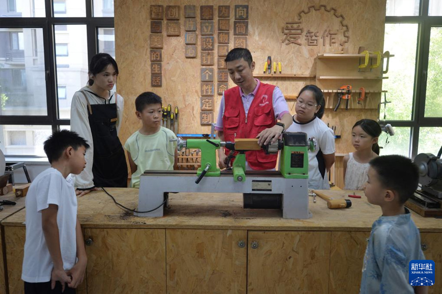1/07月26日,在山東省青島市城陽區(qū)夏莊街道華安路社區(qū)開展的暑期愛心輔導活動上,志愿者為小朋友們演示木工車床工作原理。(新華社發(fā) 王海濱/攝)