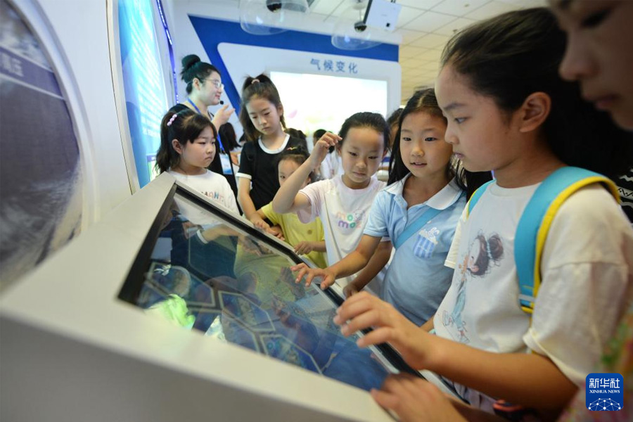 1/08月10日,山東省青島市城陽(yáng)區(qū)景明學(xué)校,小朋友在氣象科普館學(xué)習(xí)氣象知識(shí)。(新華社發(fā) 王海濱/攝)