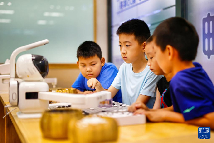 1/08月10日,小朋友在天津?yàn)I海文化中心與機(jī)器人下圍棋。(新華社發(fā) 杜鵬輝/攝)