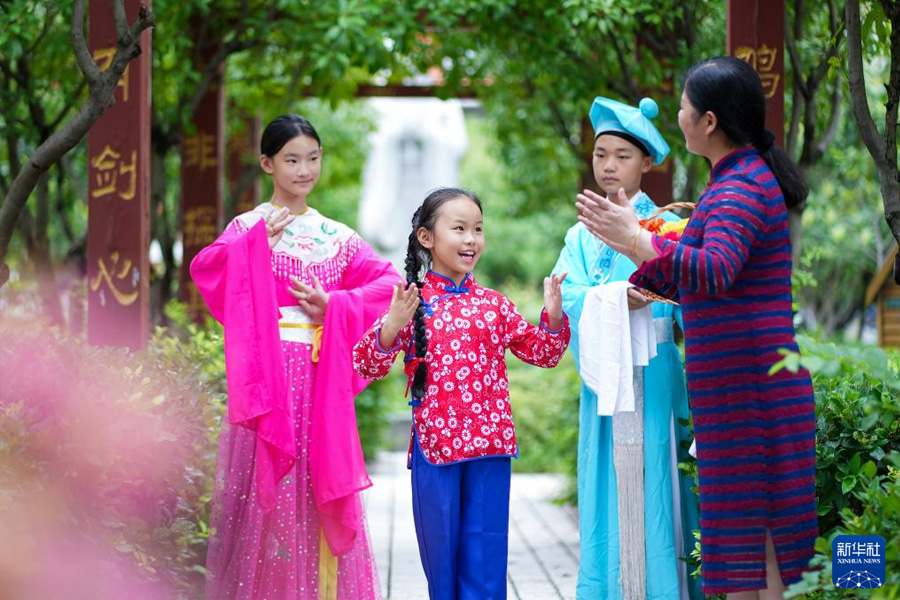 1/08月10日,在江蘇省泰州市姜堰區(qū)城西小學(xué)的少兒戲曲公益暑托班上,老師指導(dǎo)孩子們練習(xí)戲曲基本動(dòng)作。(新華社發(fā) 周社根/攝)
