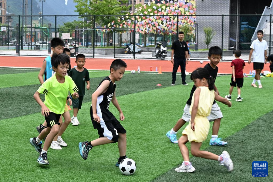 1/08月10日,在廣西河池市羅城仫佬族自治縣體育中心足球場(chǎng),小朋友在踢足球。(新華社發(fā) 韋如代/攝)
