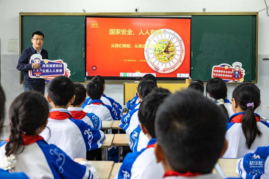 1/04月14日,貴州省安順市國家保密局宣講員在安順市第七小學(xué)為學(xué)生講解國家安全知識。第十一個全民國家安全教育日將至,各地開展形式多樣的宣傳活動,增強(qiáng)全民對總體國家安全觀的認(rèn)識,共筑國家安全防線。(新華社發(fā) 陳熙/攝)