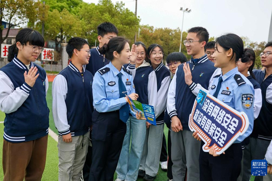 1/04月13日,江蘇省泰興市人民檢察院、市公安局法治宣講員,在泰興市實驗初中教育集團(tuán)泰師分校操場,為學(xué)生講解國家安全知識。(新華社發(fā) 顧繼紅/攝)
