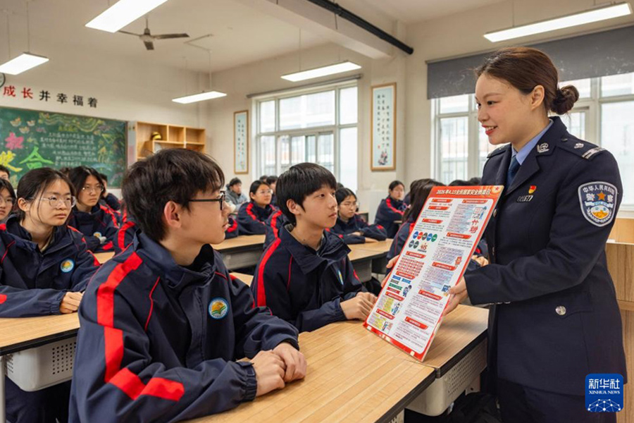 1/04月14日,民警在江蘇泰州海陵區(qū)九龍實驗學(xué)校為學(xué)生講解國家安全知識。(新華社發(fā) 湯德宏/攝)