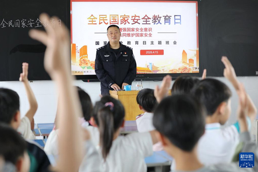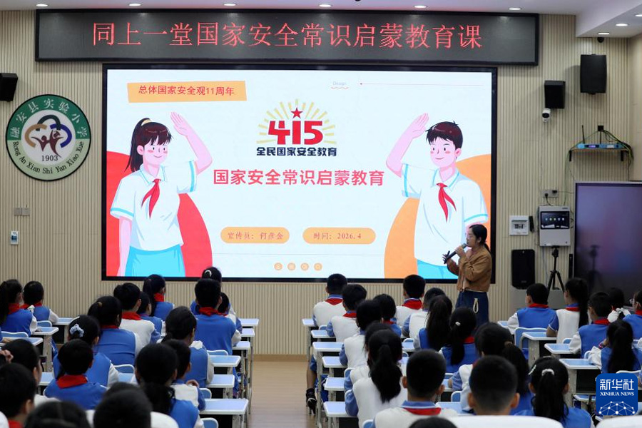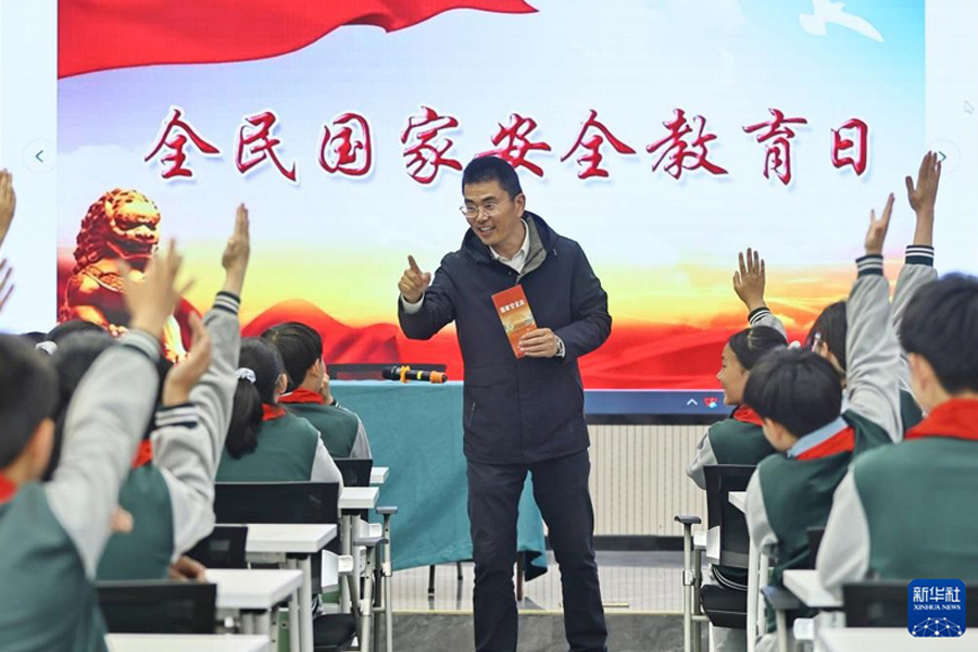 1/04月14日,在浙江省嘉興市三水灣小學(xué),學(xué)生們在“全民國家安全教育日”主題課上學(xué)習(xí)國家安全知識。(新華社發(fā) 金鵬/攝)