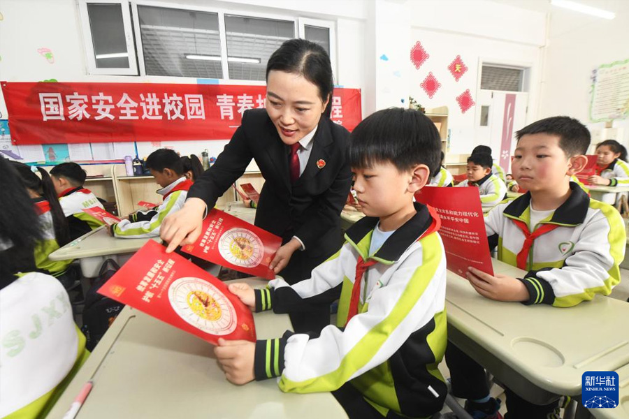 1/04月14日,在河北省石家莊新樂市民生街小學(xué),新樂市人民檢察院工作人員在給學(xué)生講解國家安全相關(guān)知識。(新華社發(fā) 賈敏杰/攝)