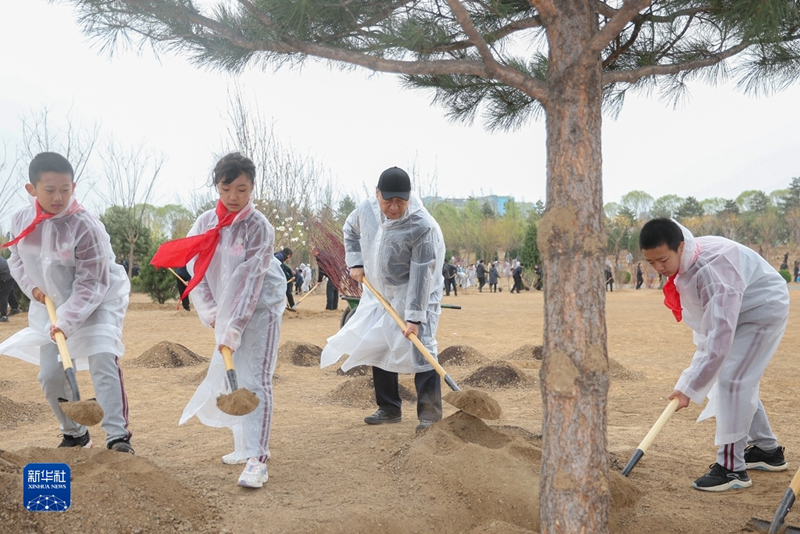 4月4日,黨和國家領(lǐng)導人習近平、李強、趙樂際、王滬寧、蔡奇、丁薛祥、李希、韓正等冒雨來到北京市朝陽區(qū)東壩中心公園參加首都義務(wù)植樹活動。這是習近平同大家一起植樹。(新華社記者 謝環(huán)馳/攝)