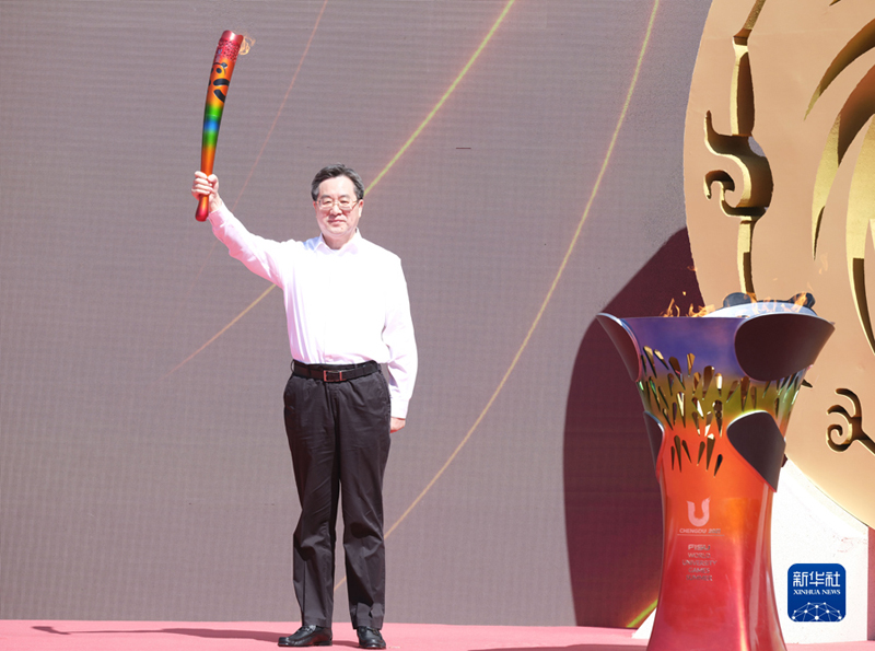 6月10日,成都第31屆世界大學(xué)生夏季運(yùn)動(dòng)會(huì)火炬?zhèn)鬟f啟動(dòng)儀式在北京舉行。中共中央政治局常委、國(guó)務(wù)院副總理丁薛祥出席儀式,點(diǎn)燃成都大運(yùn)會(huì)火炬,并宣布火炬?zhèn)鬟f開(kāi)始。(新華社記者 丁林/攝)