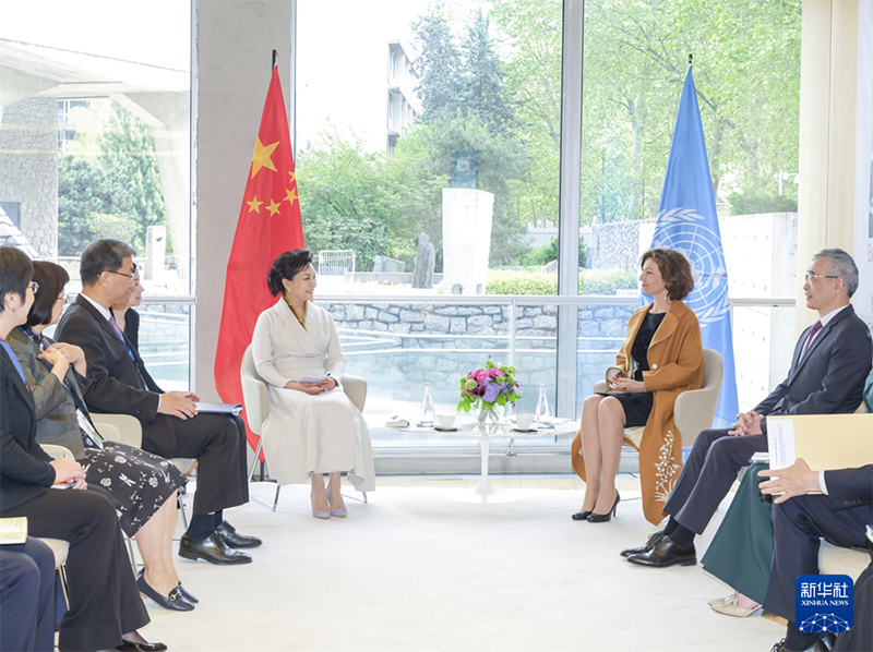 當(dāng)?shù)貢r(shí)間5月6日上午,國家主席習(xí)近平夫人、聯(lián)合國教科文組織促進(jìn)女童和婦女教育特使彭麗媛在巴黎應(yīng)邀參訪聯(lián)合國教科文組織總部并會(huì)見阿祖萊總干事。(新華社記者 丁林/攝)