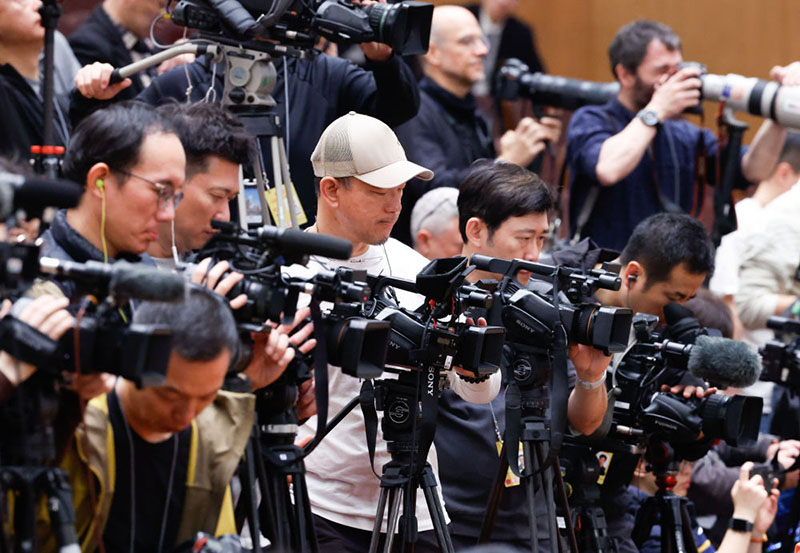 2025年3月10日,全國政協(xié)十四屆三次會議在北京人民大會堂舉行閉幕會。這是記者在會場采訪。(新華社記者 張玉薇/攝)