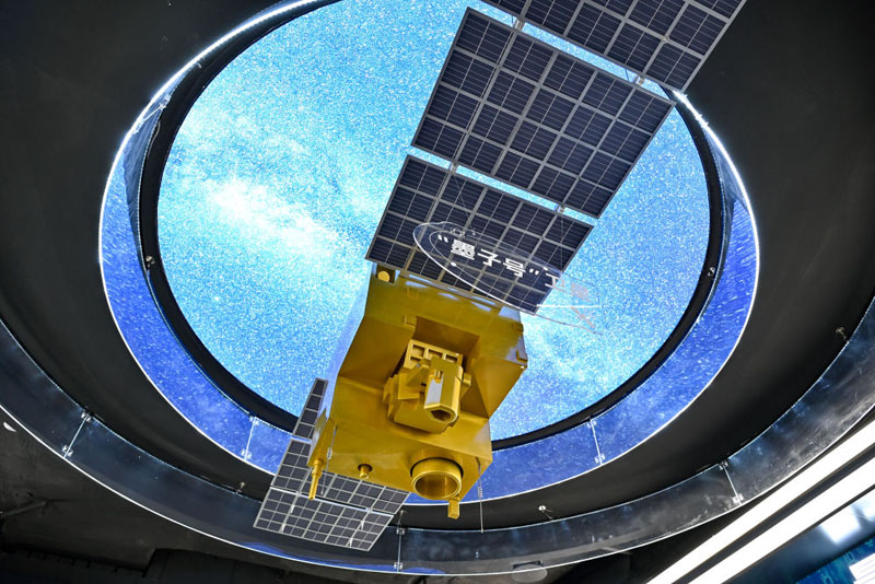 ??在位于安徽省合肥市的中電信量子信息科技集團有限公司科技體驗館內拍攝的“墨子號”量子衛(wèi)星模型(2025年7月1日攝)。(新華社記者 張鋮/攝)