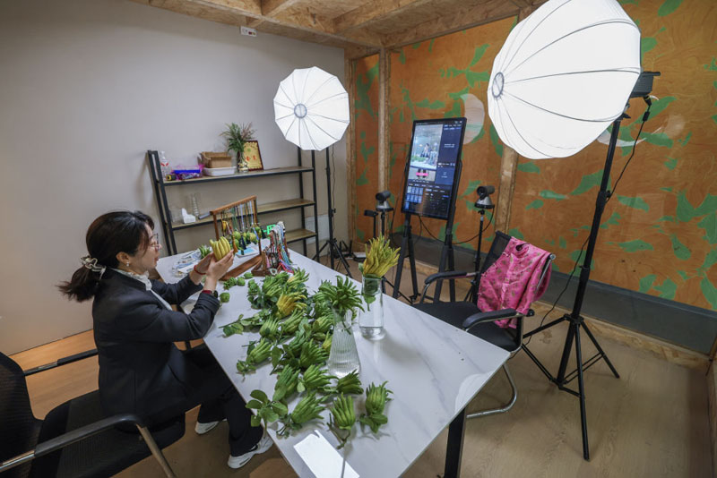 ??在浙江金華市金東區(qū)赤松鎮(zhèn)北山口村的金華佛手農林服務中心內的直播間,工作人員進行佛手鮮果及衍生產品的直播銷售(2025年10月22日攝)。(新華社記者 徐昱/攝)