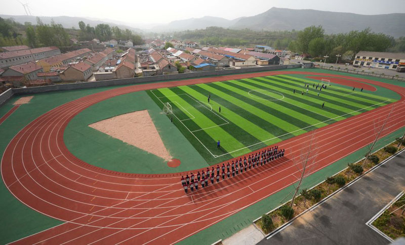 ??在位于山東濰坊市臨朐縣石家河村的臨朐縣彌水教育集團石家河校區(qū),學生在操場塑膠跑道上進行體育鍛煉(2025年4月17日攝)。(新華社記者 徐速繪/攝)
