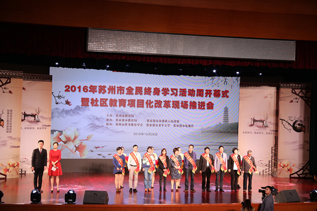 2016年10月28日,蘇州市全民終身學習活動周開幕式暨社區(qū)教育項目化改革現(xiàn)場推進會在張家港市金港鎮(zhèn)隆重舉行。本次活動周的主題為“扎實推進社區(qū)教育,建設學習型蘇州”。中國成人教育協(xié)會、江蘇省成人教育協(xié)會、江蘇省教育廳、蘇州市人民政府的領導與會并講話。蘇州市、張家港市文明辦、發(fā)改委、民政局、科技局、財政局、人社局、農委、文廣新局、體育局、總工會、團委、婦聯(lián)、科協(xié)等部門的相關領導及蘇州開放大學、蘇州市老年大學、蘇州市終身教育學會、蘇州市轄各市、區(qū)教育局、開放大學(社區(qū)學院)、鎮(zhèn)街社區(qū)教育中心的相關領導、專家及市民代表共700余人參加了本次活動。開幕式為獲得2016年蘇州市學習之星、首屆蘇州市社區(qū)教育教學優(yōu)秀成果獎和蘇州市第三批學習型鄉(xiāng)鎮(zhèn)(街道)等榮譽稱號的單位及個人進行了頒獎。全體與會人員參觀了蘇州社區(qū)教育成果展和南沙社區(qū)。