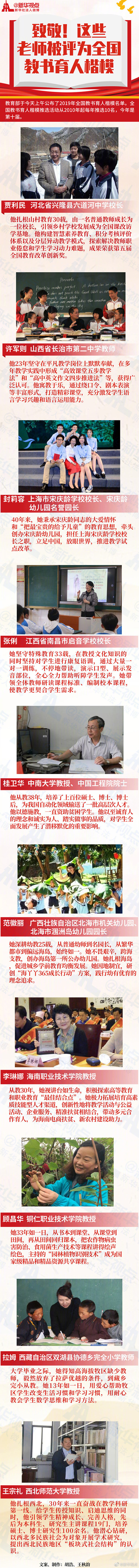 教育部教師工作司司長(zhǎng)任友群介紹,全國(guó)教書育人楷模推選活動(dòng),今年是第10屆,每年推出10位。今年的10名獲獎(jiǎng)?wù)咧?,男教?人、女教師6人;年齡最大69歲、最小33歲;鄉(xiāng)村教師2人、少數(shù)民族3人。具體名單包括:河北省興隆縣六道河中學(xué)賈利民、山西省長(zhǎng)治市第二中學(xué)許軍則、上海宋慶齡學(xué)校封莉容、江西省南昌市啟音學(xué)校張俐、中南大學(xué)桂衛(wèi)華、廣西北海市潿洲島幼兒園范徽麗、海南職業(yè)技術(shù)學(xué)院李琳娜、銅仁職業(yè)技術(shù)學(xué)院顧昌華、西藏自治區(qū)雙湖縣協(xié)德鄉(xiāng)完全小學(xué)拉姆、西北師范大學(xué)王宗禮。