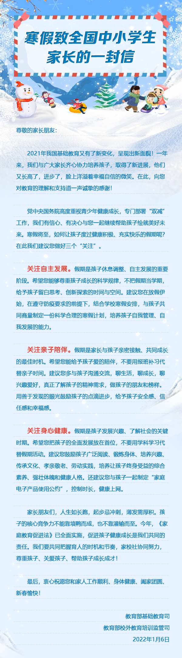 寒假致全國(guó)中小學(xué)生家長(zhǎng)的一封信
