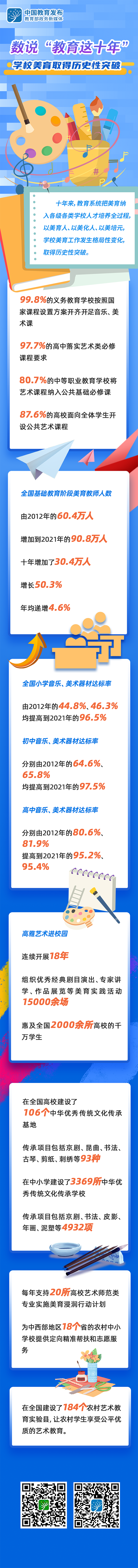 十年來(lái),教育系統(tǒng)把美育納入各級(jí)各類學(xué)校人才培養(yǎng)全過(guò)程,學(xué)校美育工作發(fā)生格局性變化,取得歷史性突破。今天的“教育新征‘圖’”專欄通過(guò)一組數(shù)據(jù),“圖”說(shuō)學(xué)校美育工作這十年——