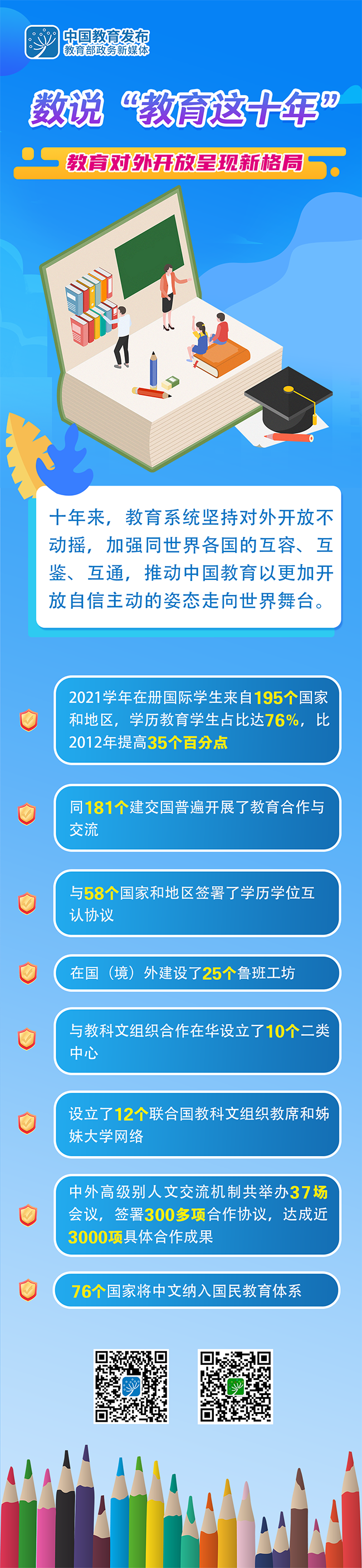 教育是國之大計(jì)、黨之大計(jì)。黨的十八大以來,我國教育面貌正在發(fā)生格局性變化。今天的“教育新征‘圖’”專欄通過一組數(shù)據(jù),“圖”說十年來教育對外開放呈現(xiàn)新格局——