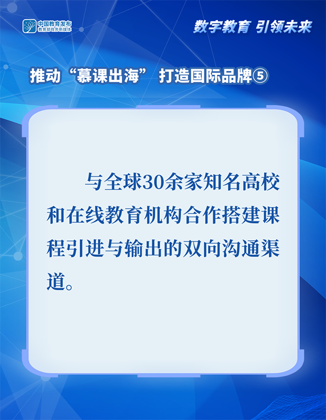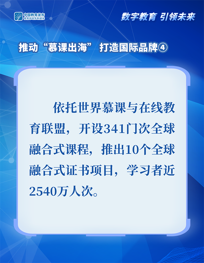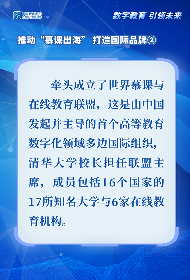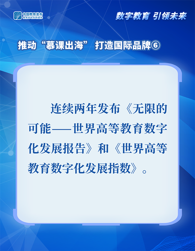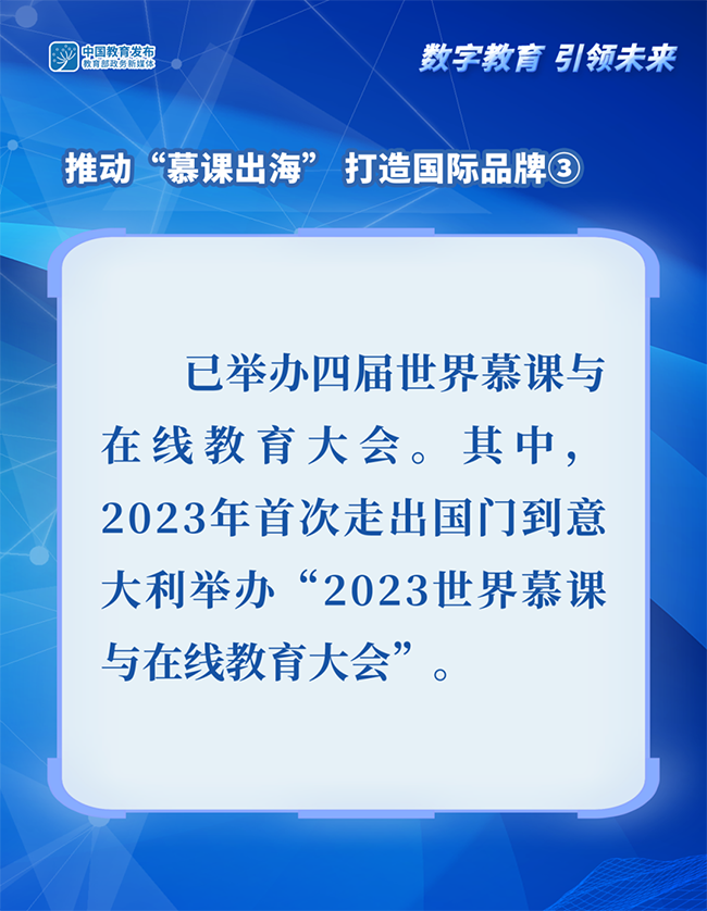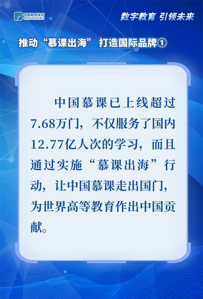 2024世界數(shù)字教育大會于1月29日-31日舉辦。教育部政務(wù)新媒體推出系列圖解,帶你了解我國推進教育數(shù)字化工作和建設(shè)學習型社會、學習型大國相關(guān)舉措。今天一起看如何推動“慕課出海”,打造國際品牌——