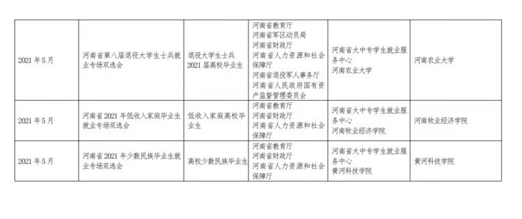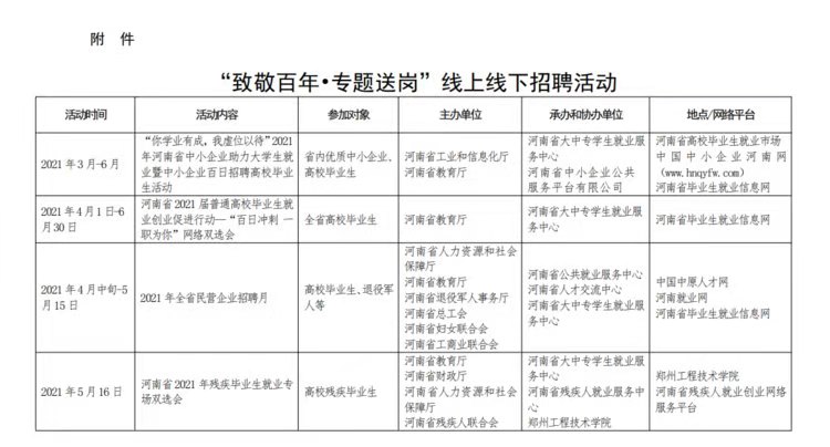 “致敬百年?專題送崗”線上線下招聘交流活動(dòng)。5月13日至19日,省教育廳聯(lián)合14個(gè)省直部門共同開展“新時(shí)代·新夢(mèng)想”特殊群體畢業(yè)生就業(yè)公益幫扶行動(dòng),舉辦退役大學(xué)生士兵、殘疾畢業(yè)生、低收入家庭畢業(yè)生、少數(shù)民族畢業(yè)生等就業(yè)專場(chǎng)雙選會(huì)。各高校將積極參與教育部“24365 校園招聘服務(wù)”百日招聘行動(dòng)及我省2021屆普通高校畢業(yè)生就業(yè)創(chuàng)業(yè)促進(jìn)行動(dòng)——“百日沖刺,一職為你”網(wǎng)絡(luò)雙選會(huì)、“你學(xué)業(yè)有成,我虛位以待”2021年河南省中小企業(yè)助力大學(xué)生就業(yè)暨中小企業(yè)百日招聘高校畢業(yè)生活動(dòng),高頻次高質(zhì)量開展線上線下校園招聘會(huì)。