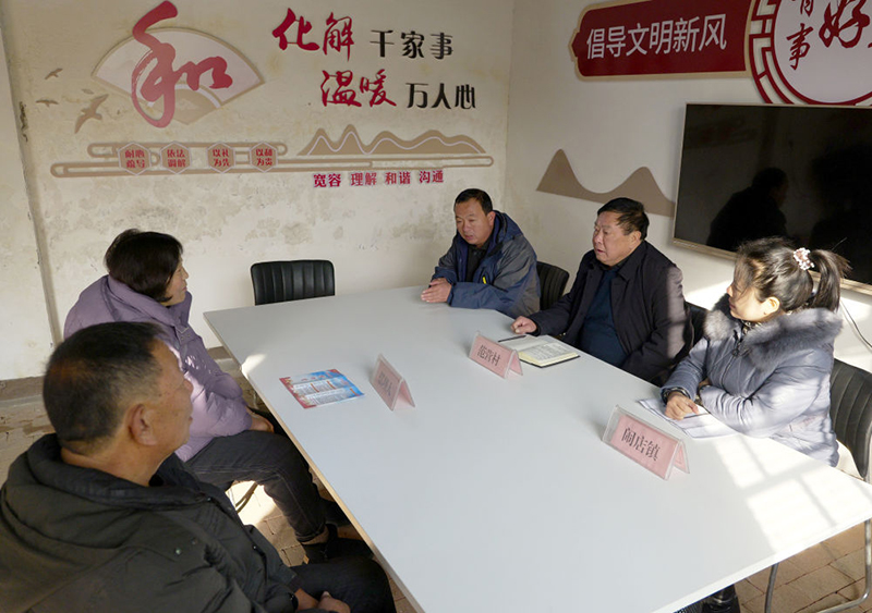 在寶豐縣鬧店鎮(zhèn)范營村“擺理堂”,村鎮(zhèn)干部(右)為村民進(jìn)行信訪調(diào)解(2023年12月20日攝)。河南省寶豐縣積極推進(jìn)四下基層工作深入開展,已打造鬧店鎮(zhèn)范營村“擺理堂”、石橋鎮(zhèn)東大莊村“老娘舅茶室”等系列鄉(xiāng)村社區(qū)服務(wù)陣地,協(xié)調(diào)鄰里關(guān)系,有效化解各類矛盾,同時不斷豐富工作內(nèi)容,拓展服務(wù)功能,助力鄉(xiāng)村振興。(新華社記者 李嘉南/攝)
